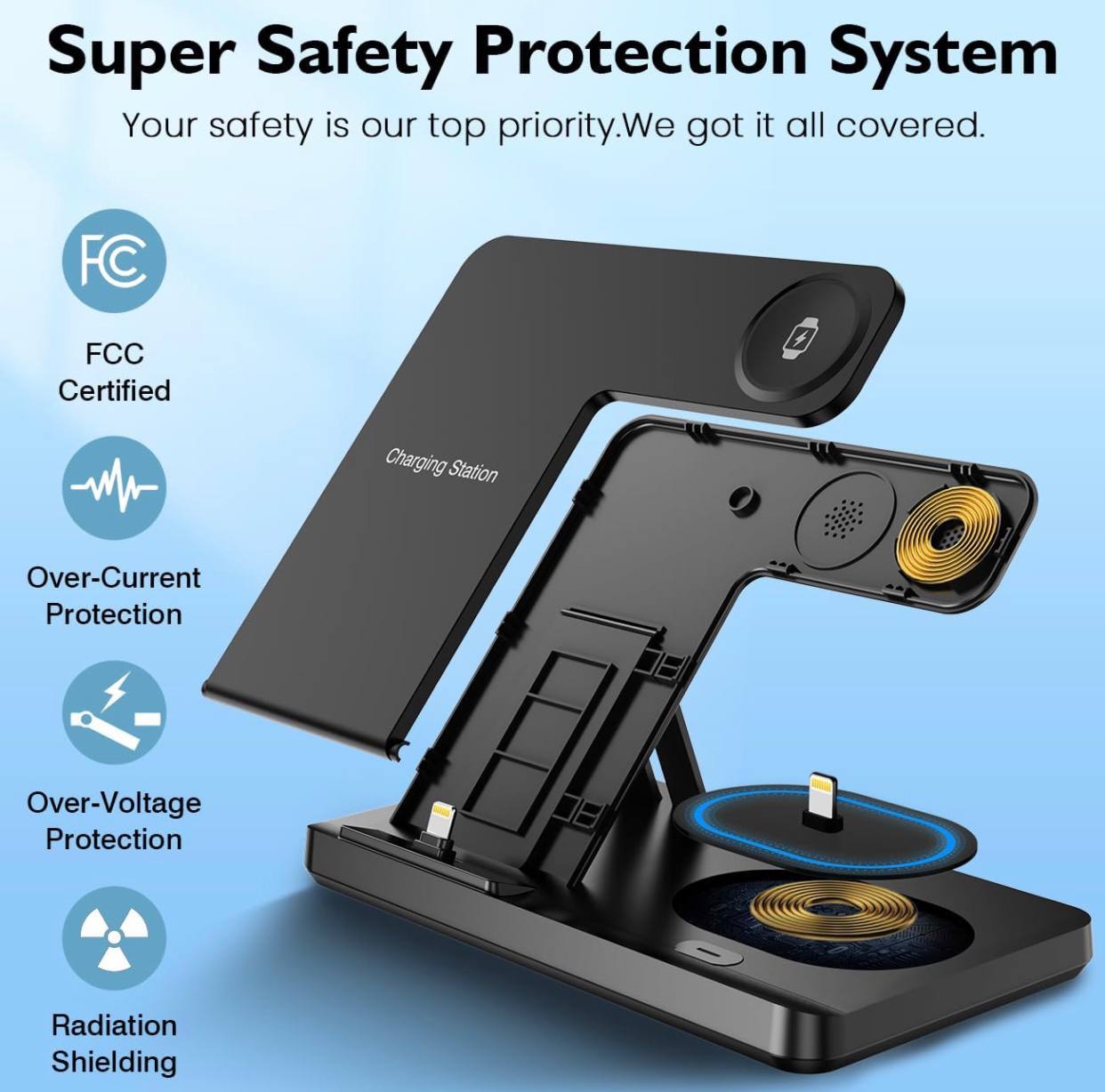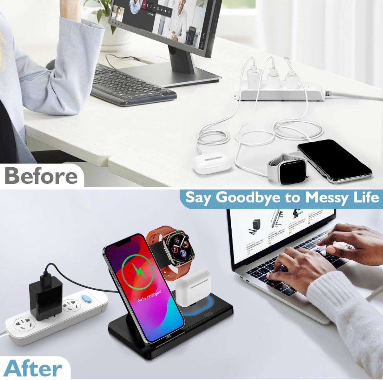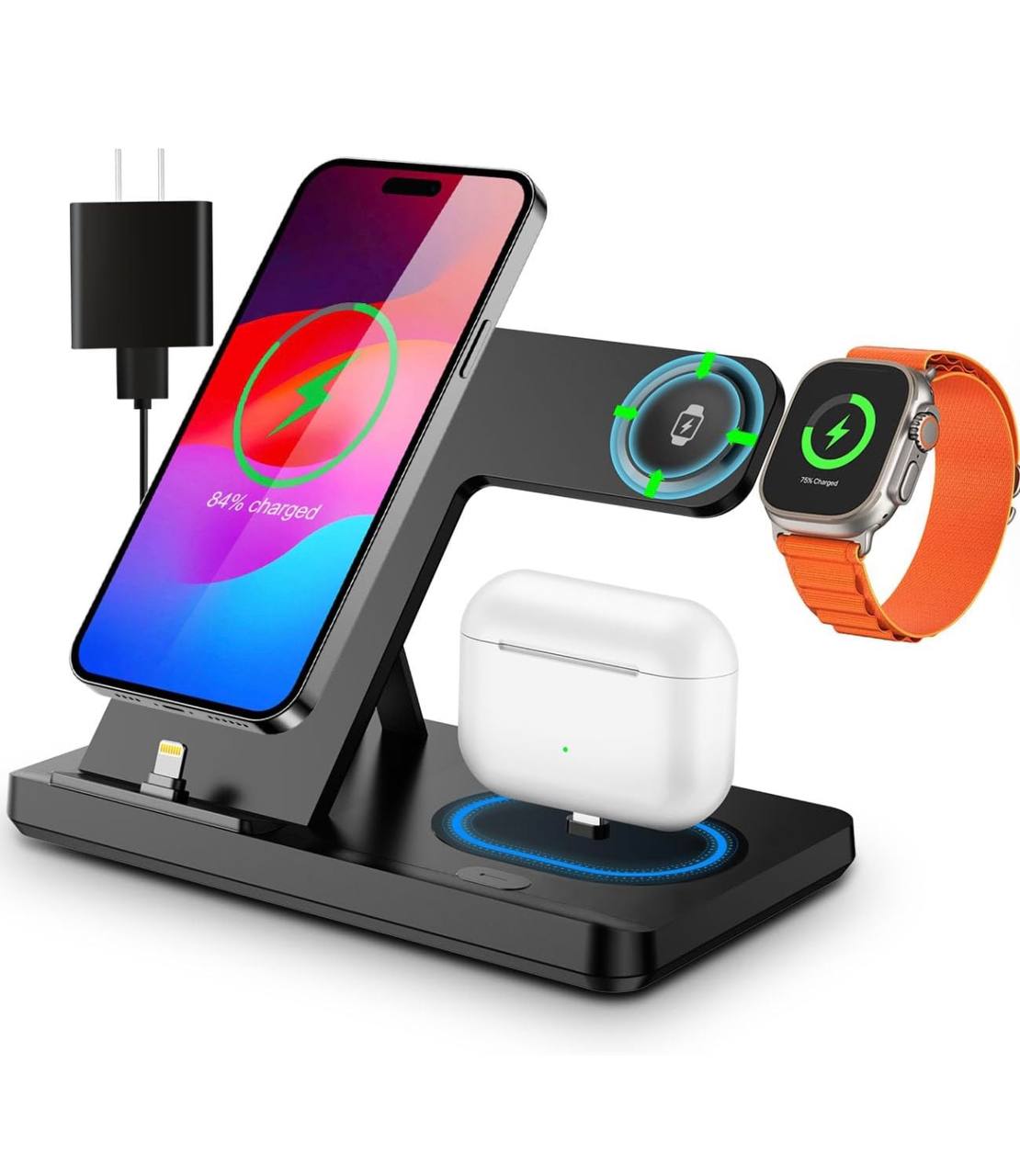 Cargador inalámbrico 3 en 1: una estación de carga para dispositivos Apple que cargan tus Airpods, iPhone y Apple Watch simultáneamente. Compatible con iPhone 15 14 13 12 11 8 Pro Max Mini Plus X XR XS Max SE Plus, Apple Watch Series 9 8 7 6 5 4 3 2 SE, AirPods 2 3 Pro Pro 2 (Nota: para Airpods 2 3, necesita trabajar con una funda de carga inalámbrica). También puede cargar otros teléfonos con capacidades de carga inalámbrica